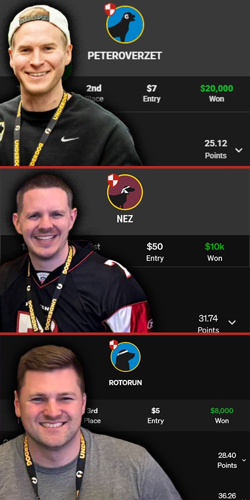 Peter Overzet (peteroverzet): Pete has amassed over $75k in NFL Battle Royale winnings over the past two years, including a monster 2024 season where he had 3 Top 10 finishes and shipped multiple tournaments (Da Bomb, Victory Formation). He regularly streams best ball drafts and DFS strategy on his Youtube channel. A.J. Nesbit (nez): Nez has won over $150k in NFL Battle Royales dating back to 2022, including a Dawg Bowl Qualifier in 2023. He streams Underdog Battle Royale content daily for all sports on the BadgeBros Youtube channel with Jon. Jon Warner (rotorun): A macro strategy and game-theory expert in draft games, Jon has racked up north of $100k in NFL daily winnings on Underdog since 2022. He specializes in high-dollar, small-field, contests and Prime Time Palooza slates. He streams daily with Nez on The BadgeBros Youtube channel.